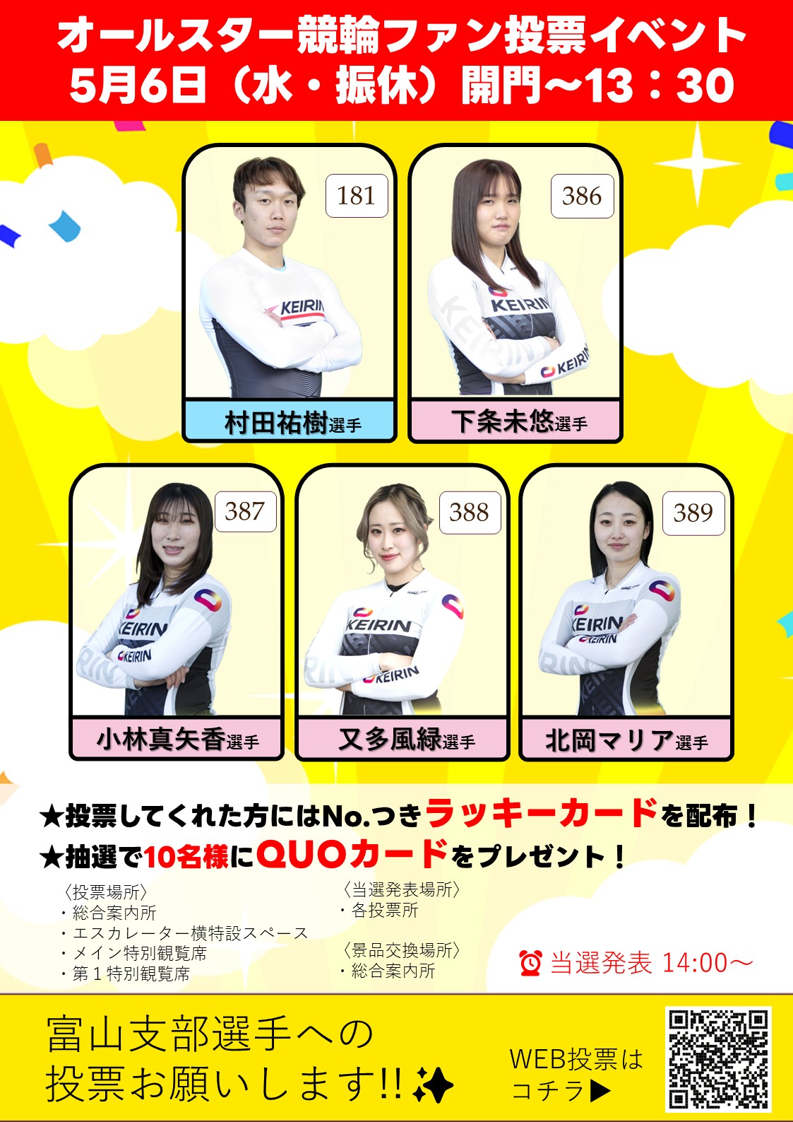 富山競輪場にて第69回オールスター競輪GⅠ及び第2回女子オールスター競輪GⅠ出場選手の選考に係るファン投票を実施します。