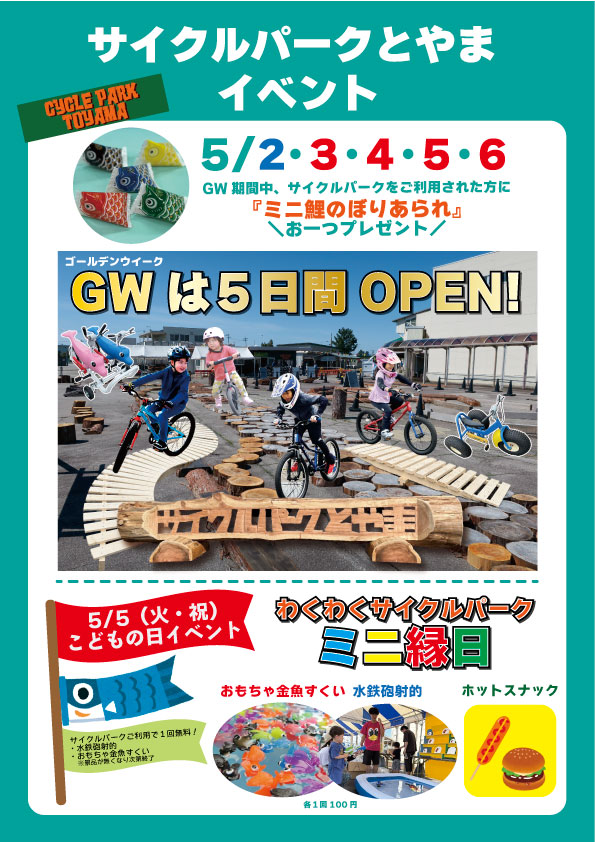 『サイクルパークとやま』は5月2日(土)から6日(水・振休)の5日間、毎日営業!